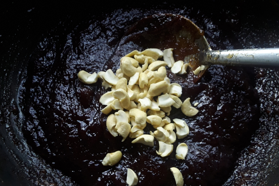 9. Cook further stirring continuously. Mixture starts thickening, also turns dark.