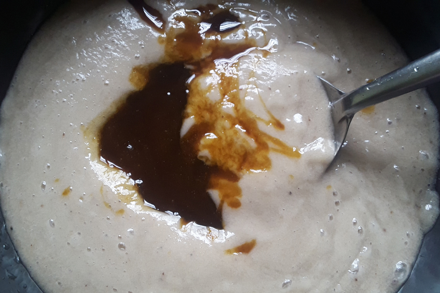 8. Once jaggery is well combined with banana puree, add ghee and mix well.