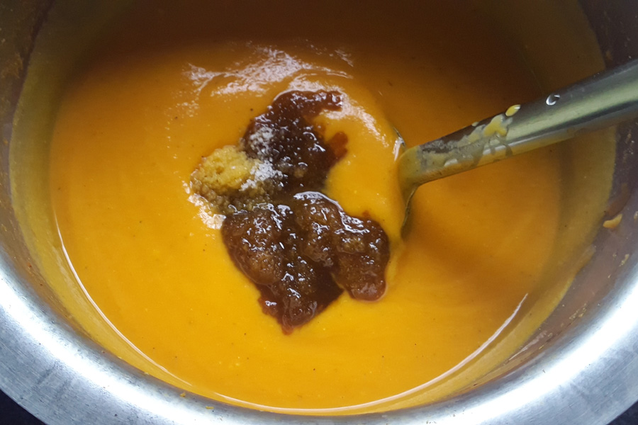 13. Add 1 tablespoon jaggery or as required. Add 1/6 teaspoon salt.