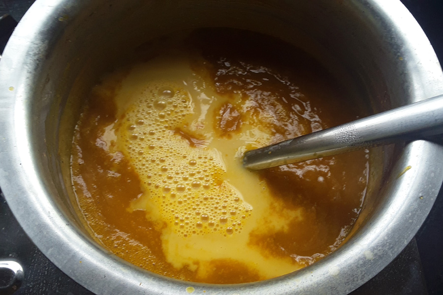 16. When the mixture begins to boil, add milk and mix well. Let it get properly heated.