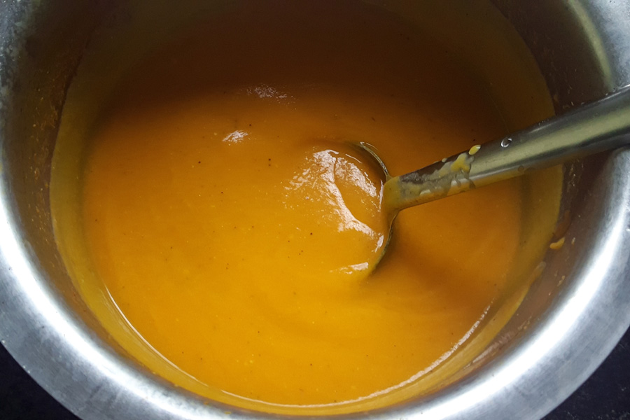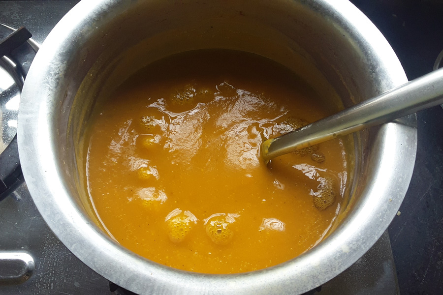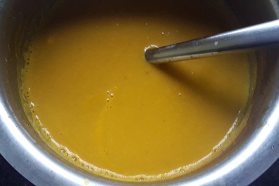 12. Take the carrot puree in a pan or vessel. Add leftover carrots boiled water and mix well.