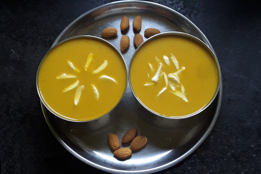18. Garnish with almond slices and serve gajari paayasa hot or warm or cold.