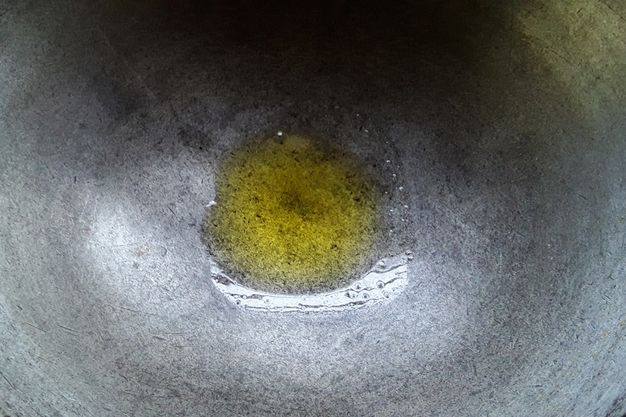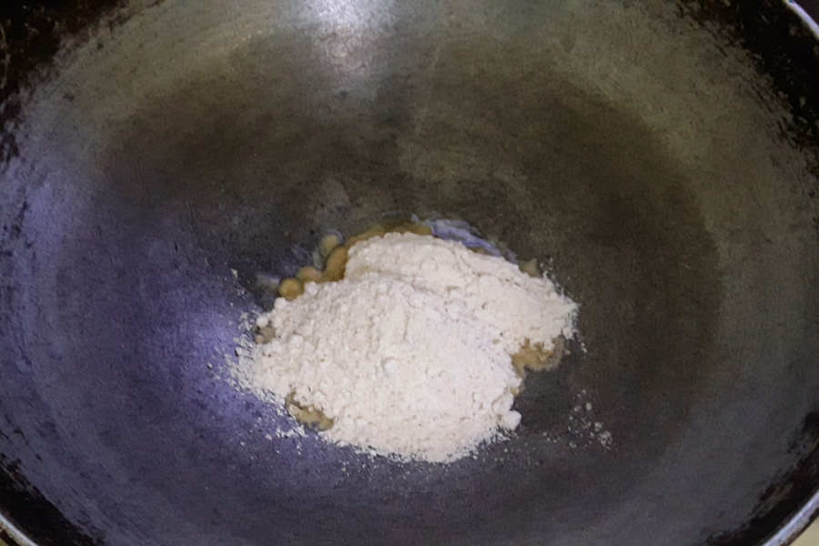 5. Mix well and begin to sauté the wheat flour on a low to medium heat.