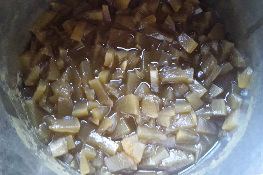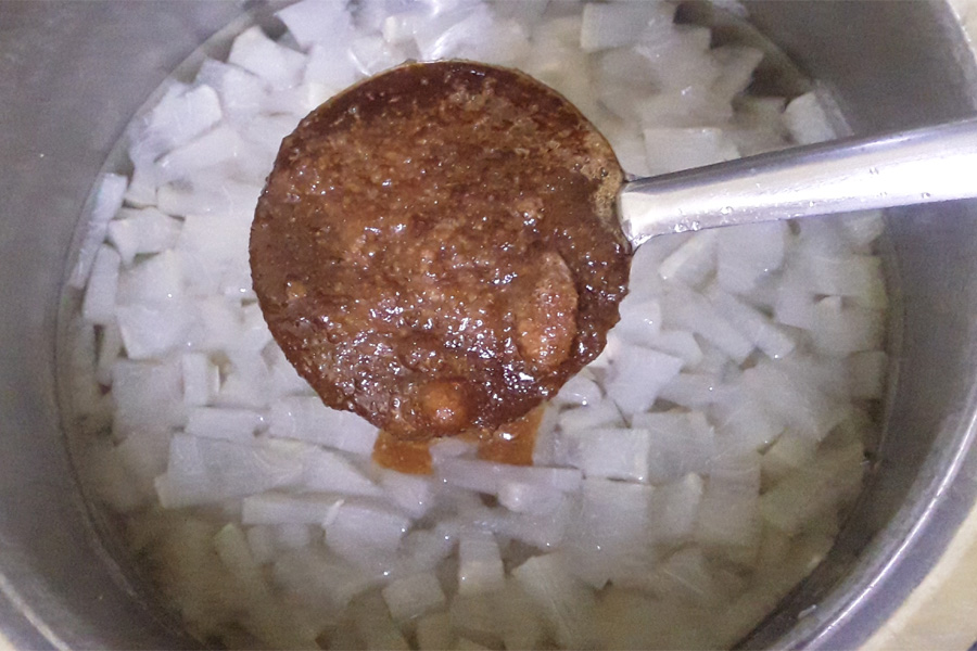 9. Now, once the bottle gourd is cooked to a soft texture, add 2 tablespoons jaggery or as required. Add 1/4 teaspoon salt or as required.