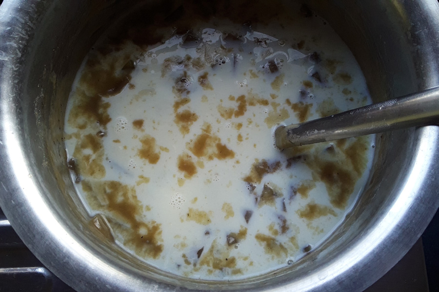 You can switch off the heat once the paayasa is heated properly or can bring it to boil depending upon the jaggery used. If the jaggery is sour milk will curdle when boiled.