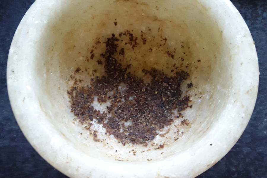 8. Take 5 cardamoms, remove the seeds, rinse them, and crush them to a fine powder using mortar and pestle. Cover and keep aside.