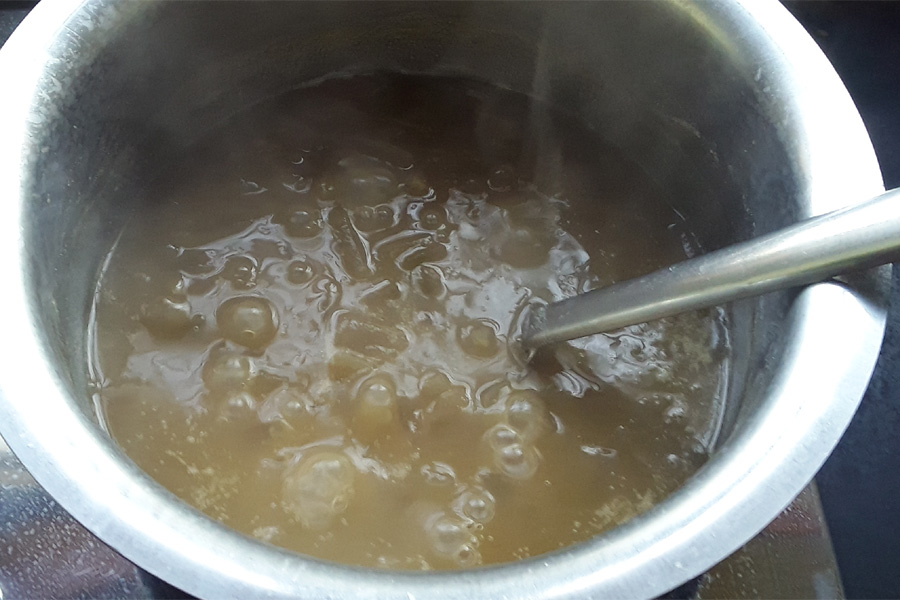 13. Once the paayasa mixture thickens, reduce the heat to low.