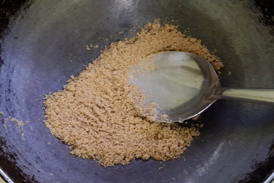 6. Stir non-stop and sauté until it turns golden or brown and aromatic. Switch off the heat and let it become warm or cool.